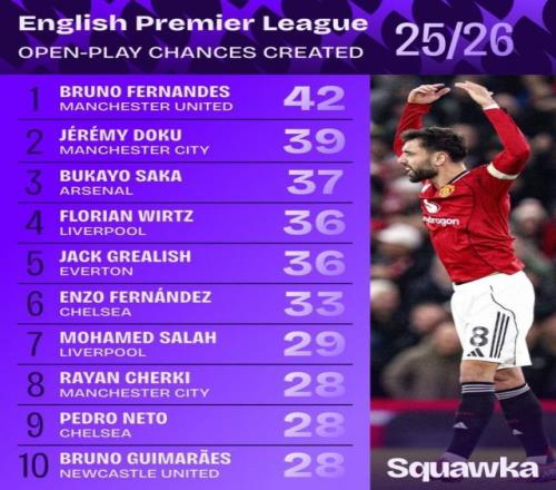 Squawka统计本赛季至今英超球员运动战创造机会次数,B费42次居首,多库39次第二,萨卡37次第三。